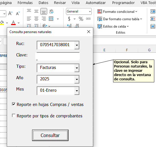 - Consultar comprobantes recibidos usando RUC y clave de persona natural (habilitado para facturas) desde la plantilla de Excel.