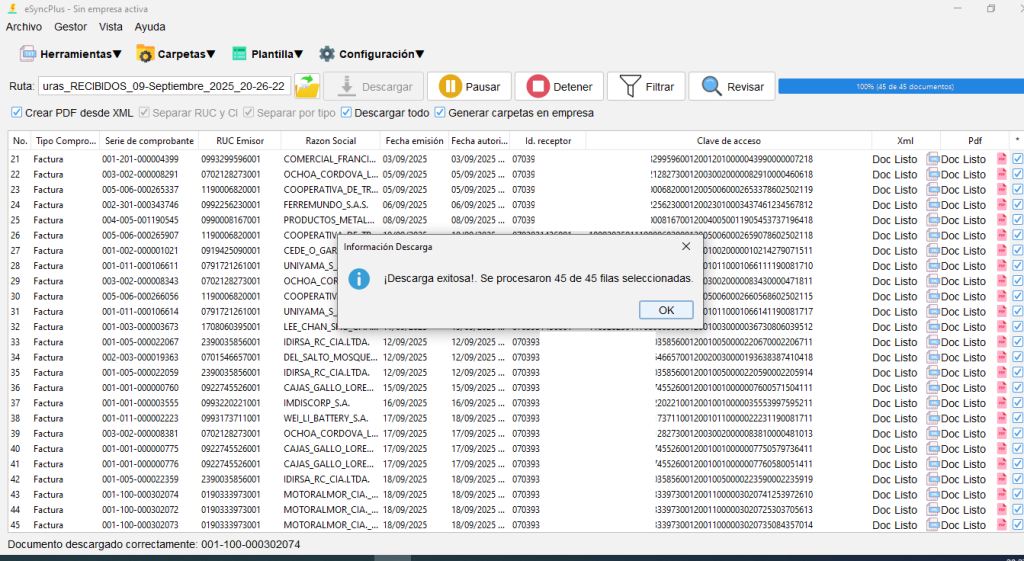 - Organización Automática e Inteligente 📂 Deja que eSyncPlus trabaje por ti. El sistema crea y organiza automáticamente tus archivos en carpetas por empresa, año y mes. Si prefieres tu propio método, el modo manual te da control total sobre el destino de tus archivos.